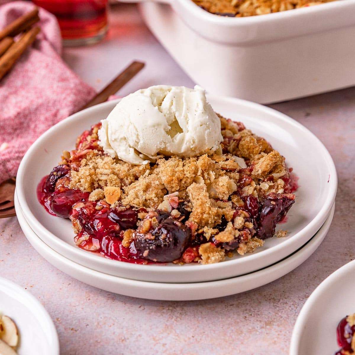 Easy Cherry Crisp is a delicious dessert made with fresh cherries, cherry juice and a crunchy oat topping. Tastes just like a cherry pie!