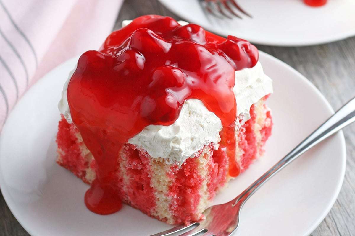 Poke cakes are so fun, and this Cherry Poke Cake is no exception. Easier to make than just a white cake with cherry filling, and more delicious too!