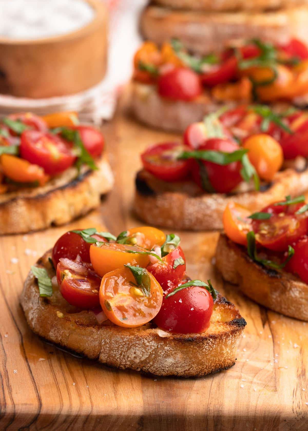 Cherry Tomato Bruschetta is a simple and delicious appetizer for summer entertaining. With fresh tomatoes, fragrant basil, and grilled garlic toast, this easy recipe makes a beautiful presentation.