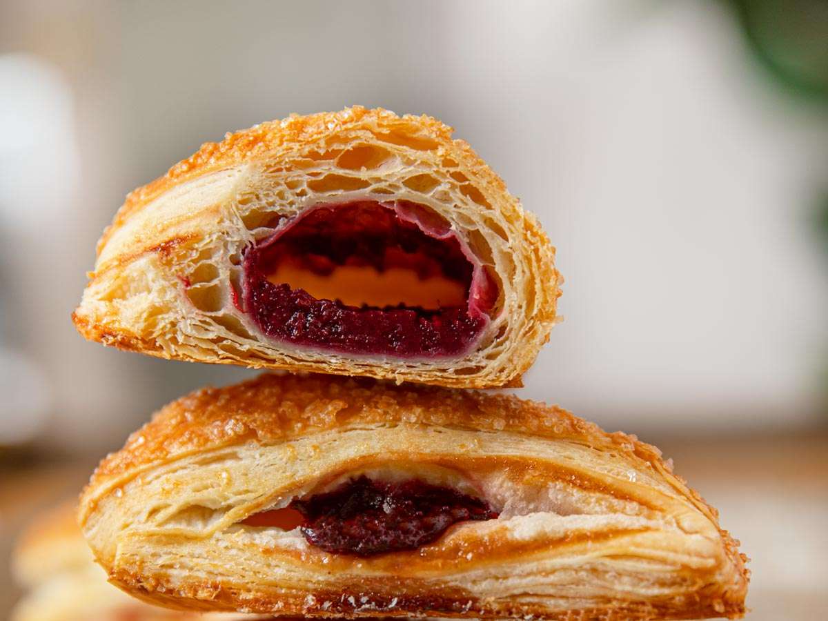 - Evenly distribute the cherry mixture in the center of each of the 8 pastry squares, then fold one corner of each square of dough over to the opposite corner.