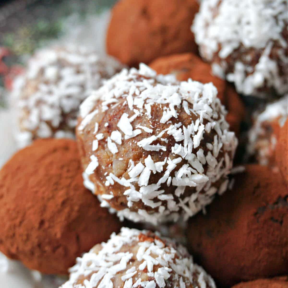 Chestnut Truffles with medjool dates and dark chocolate, and dusted with cocoa powder or desiccated coconut, a healthy and delicious treat that is vegan, gluten free and low in calories. It's an excellent treat over the festive season when chestnuts are very popular, but also all year round.