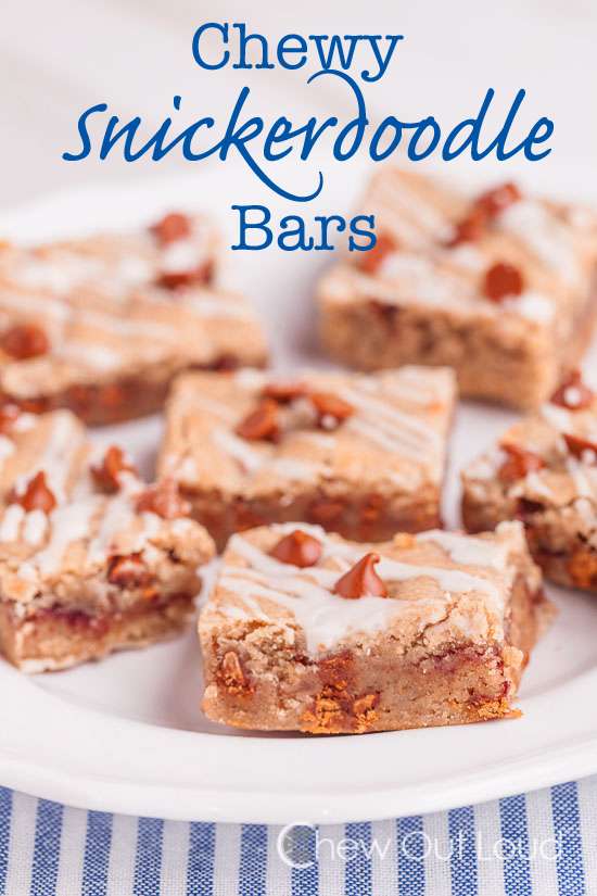 These snickerdoodle bars are slightly crispy on the exterior and wonderfully chewy on the inside. They are chock full of cinnamon and cinnamon morsels, making them doubly delicious. They're easy to make and perfect for the holidays.