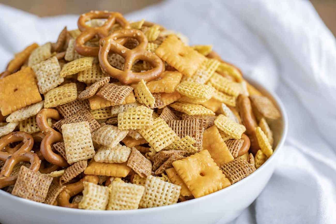 Chex Mix made with cereal, pretzels, crackers, and melted seasoned butter is the PERFECT combo of savory and crunchy for your next party!