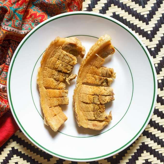 - Retirer rapidement les couennes de porc de l’huile à l’aide d’une écumoire car le processus de friture prend environ 20 secondes.