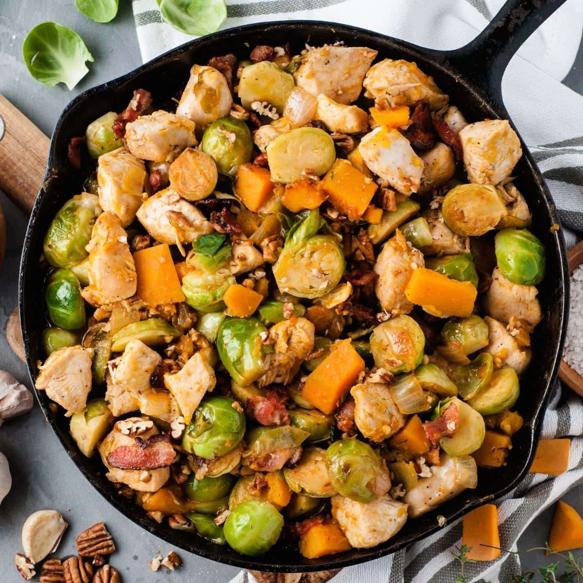 - Increase skillet heat back to medium-high. Add the Brussels sprouts, Hubbard squash, onion, garlic, thyme and 1/2 teaspoon salt.