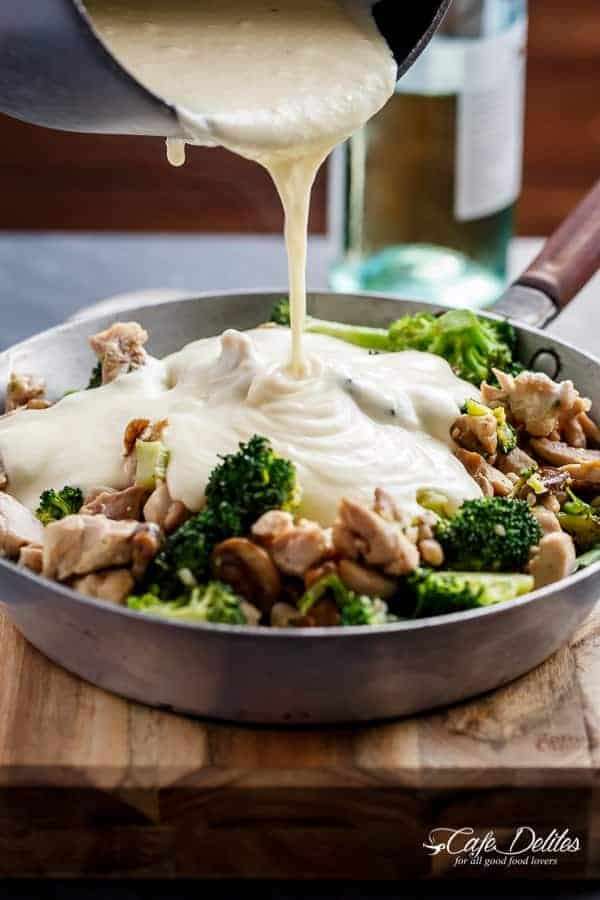 - Pour the Bechamel sauce over the chicken and mix through. Sprinkle over some parmesan cheese and serve over pasta or rice or Zoodles!