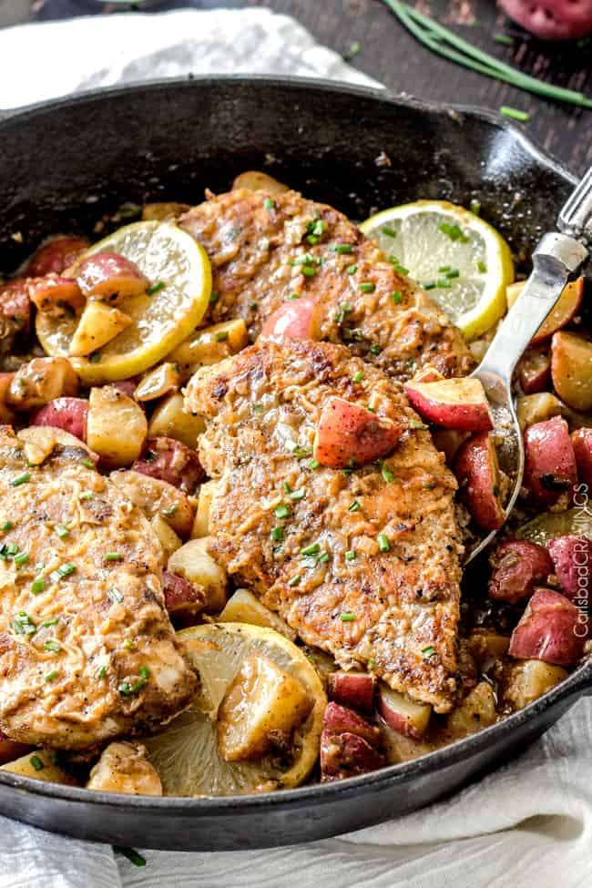 - When potatoes are tender and sauce has thickened, stir in chives and lemon juice. Add chicken to skillet and cook for 1 more minute to reheat chicken. Serve immediately, seasoning individual servings with additional salt and pepper and freshly squeezed lemon juice to taste.