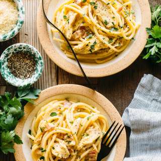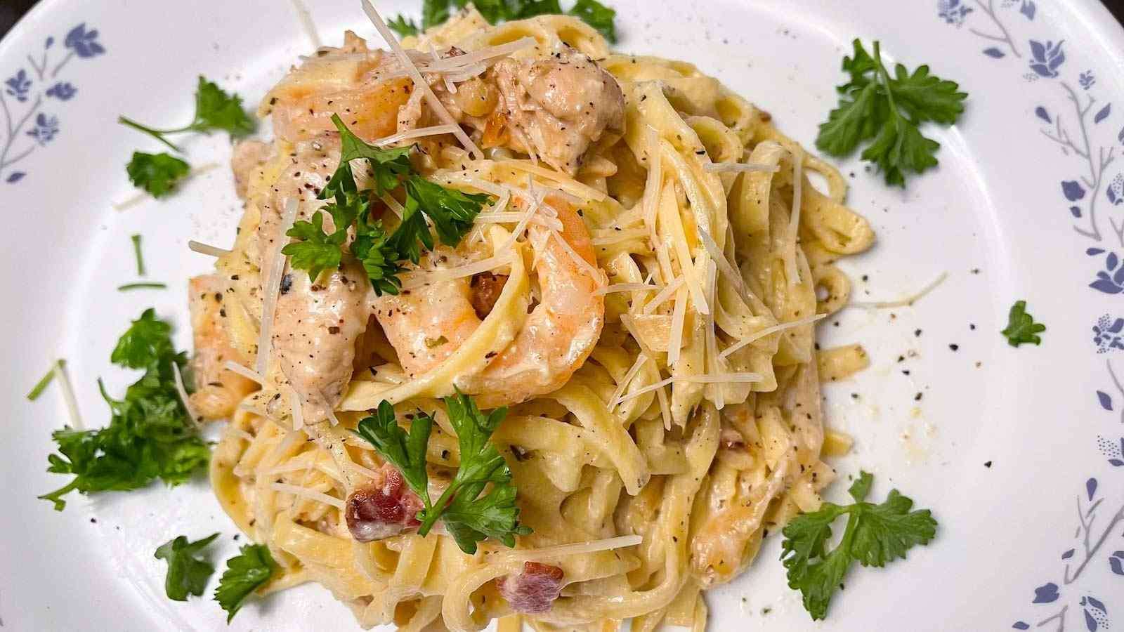 - Add the chicken shrimp carbonara to serving plates and garnish with optional fresh parsley to serve.