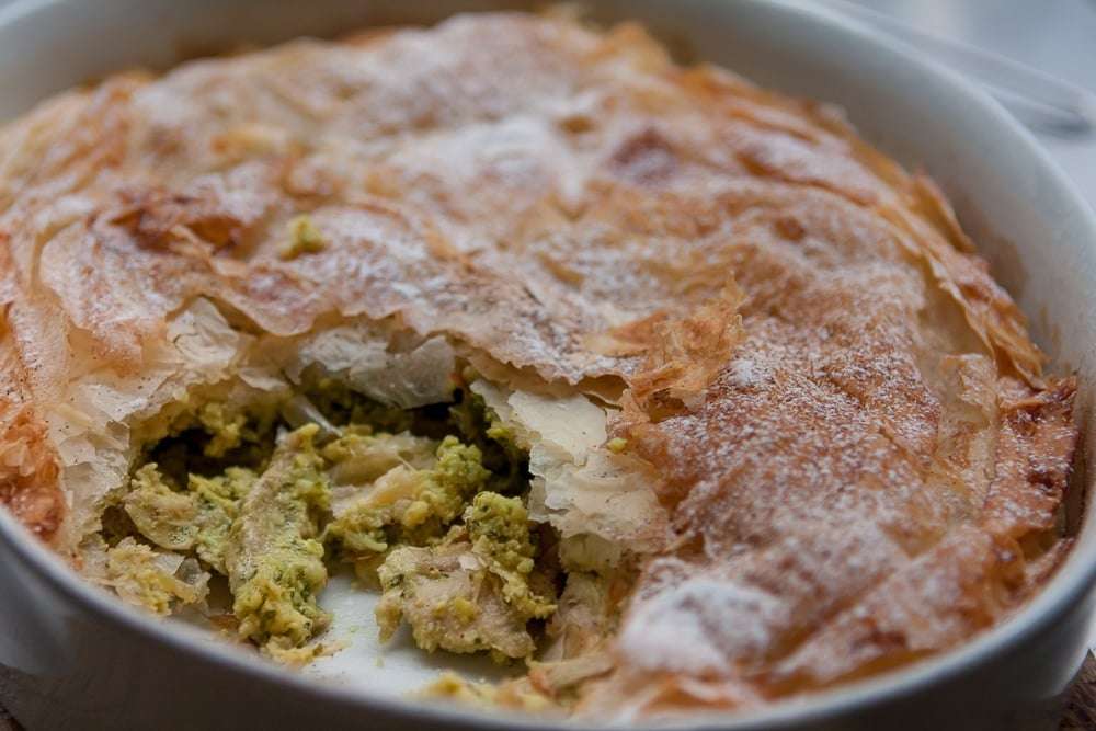 - Unwrap the filo and drape a damp kitchen towel over it to prevent it from drying out as you work. Working quickly, lay one sheet of filo dough over the bottom of the baking dish, coaxing it to line the bottom and up the sides of the dish. Brush the filo with melted butter. Add three more sheets of filo dough, brushing each one with a layer of butter, except for the final one.