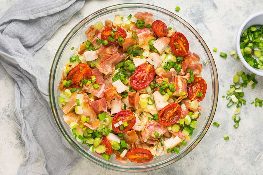 - In a large bowl, combine the chicken, cauliflower, tomatoes, bacon, and dressing. Lightly fold to mix through.