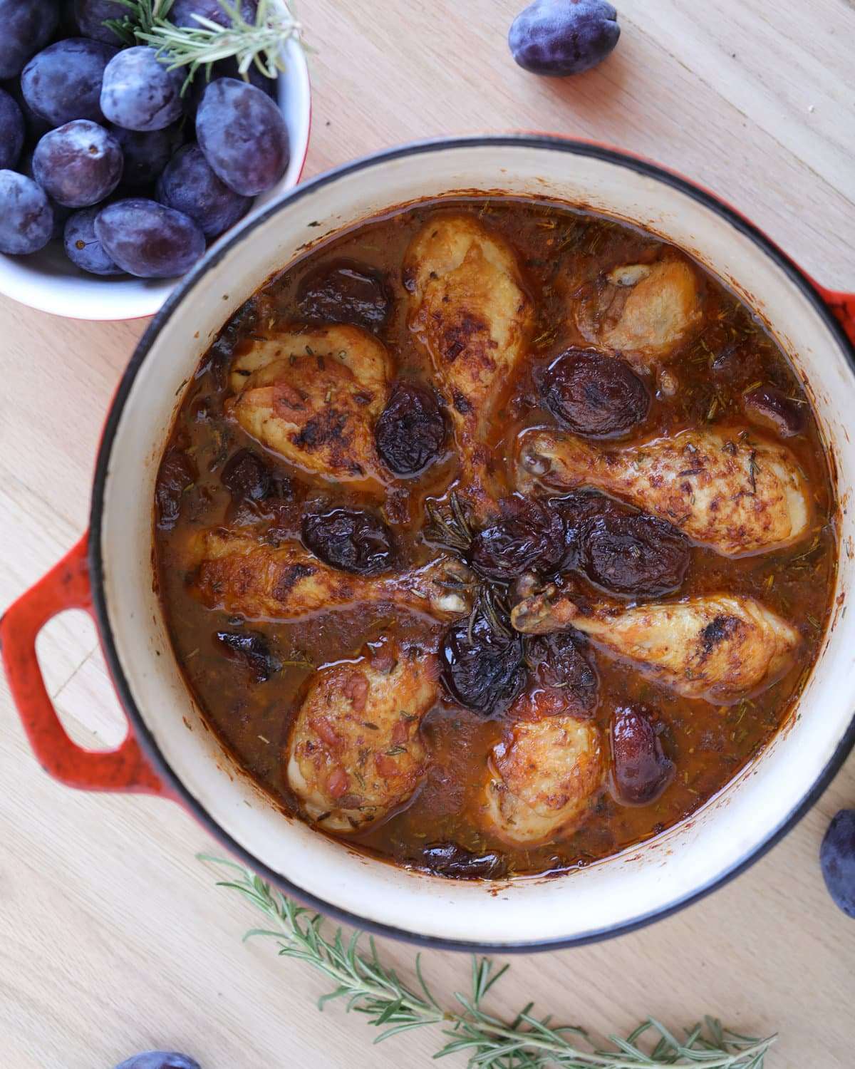 - Optional: Right before serving set the oven to broil. Place the pot of chicken and plums in the oven for 5 minutes (watch carefully as broilers are different) to get the chicken skin extra crisp on top!
