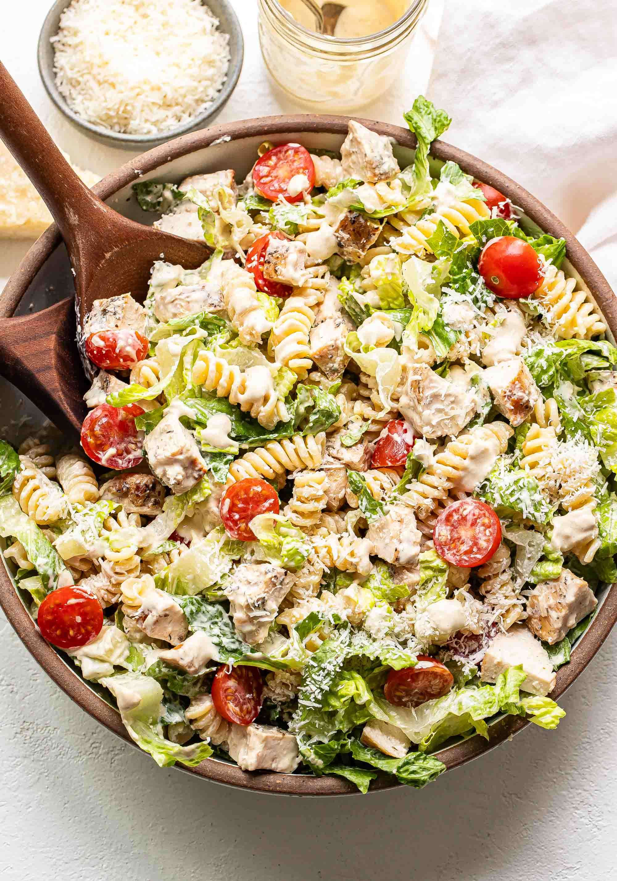 - Add the pasta to a large serving bowl along with the chicken, romaine lettuce, and tomatoes.