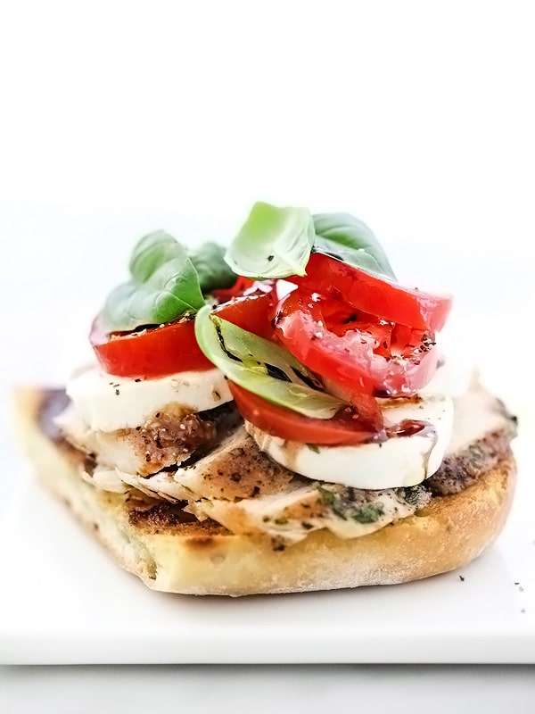 - Cut the bread into 3 slices for each half. Layer each slice with 3-4 slices of chicken, a few slices of mozzarella cheese and top with tomato slices. Drizzle with olive oil, balsamic vinegar or glaze and top with basil leaves. Season with more salt and pepper and serve.