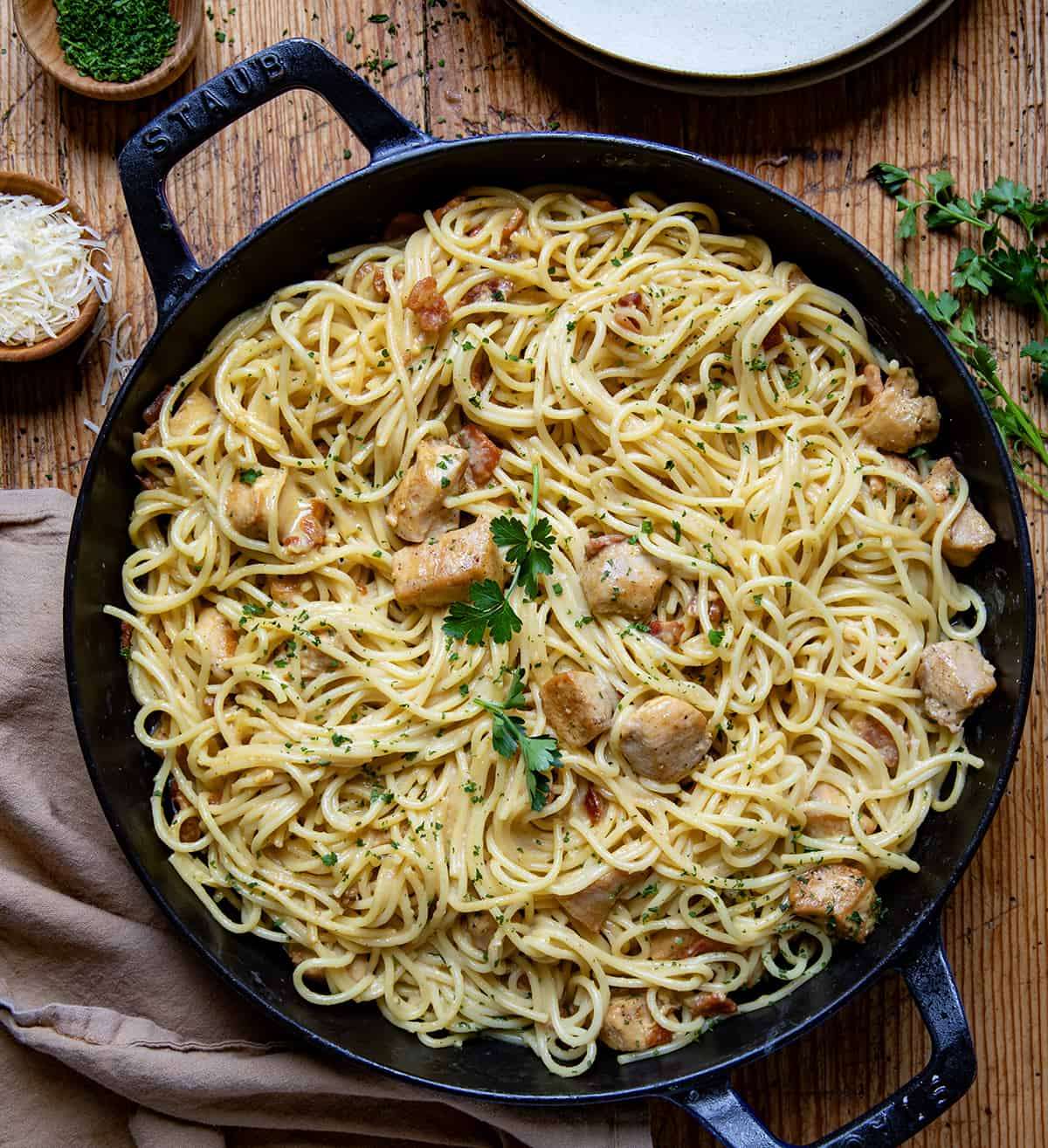 Chicken Carbonara is a pasta dish made with al dente spaghetti, creamy sauce, crispy bacon, and tender chicken with the taste of parmesan cheese in every bite. It may not be authentic carbonara, but it is so delicious and easy to make! It may be your new favorite way to eat spaghetti!