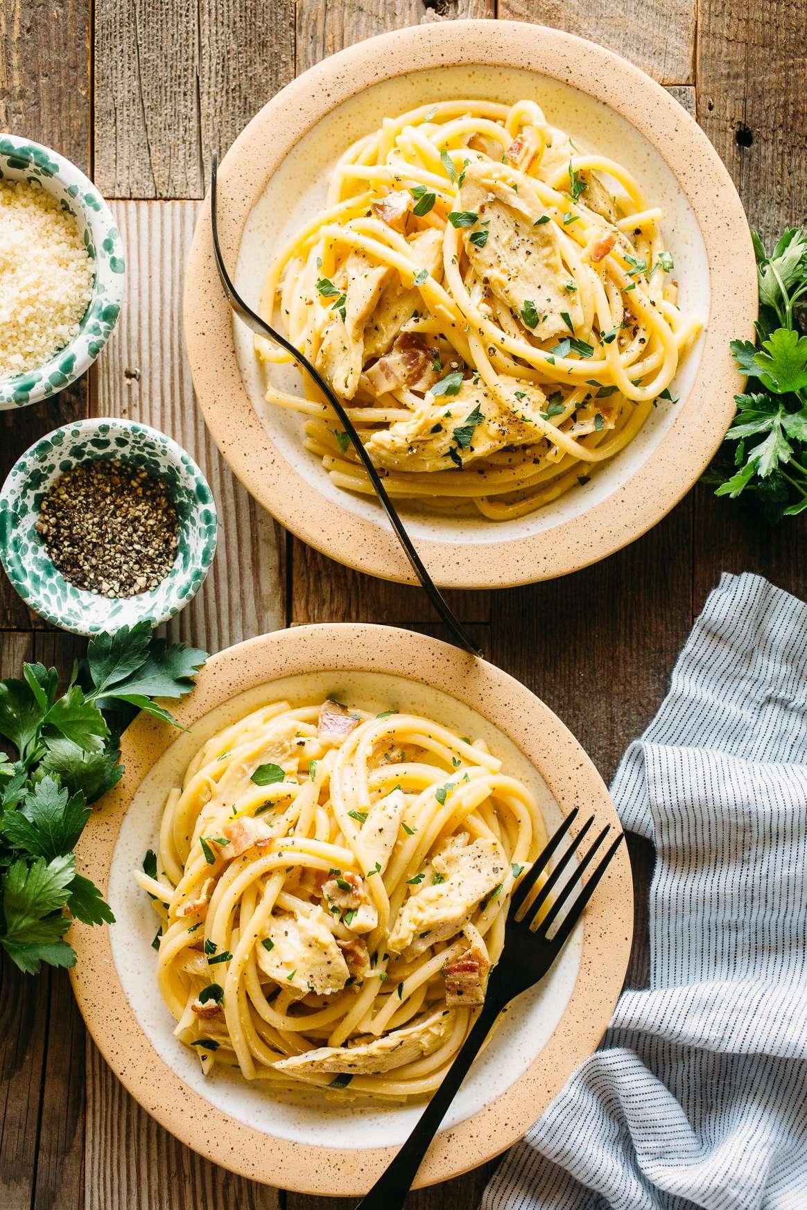 - To serve, divide carbonara between 4 plates and top with extra parsley, Parmesan cheese and black pepper. Enjoy immediately.