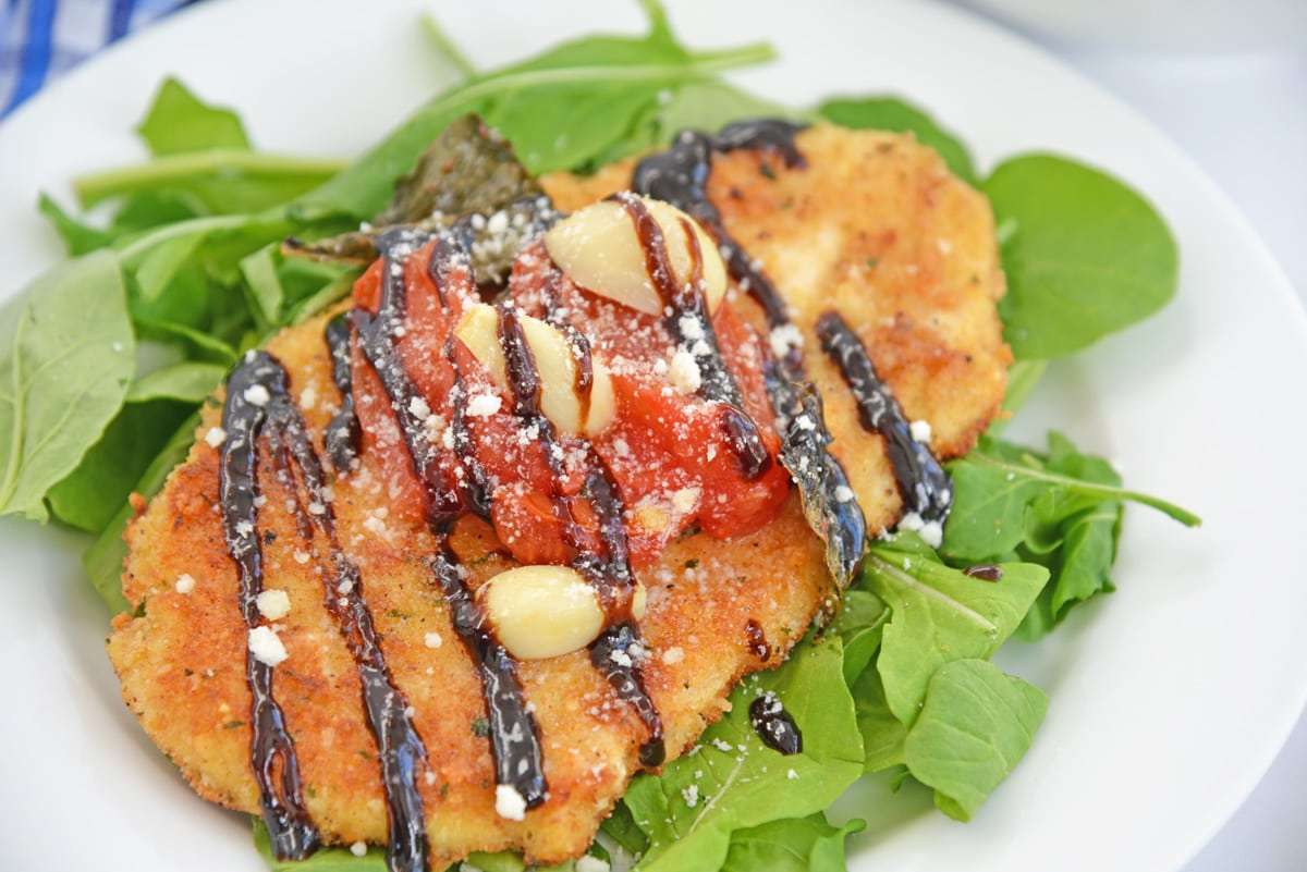 Breaded chicken cutlets with a roast tomato and garlic topping and balsamic sauce served over arugula.