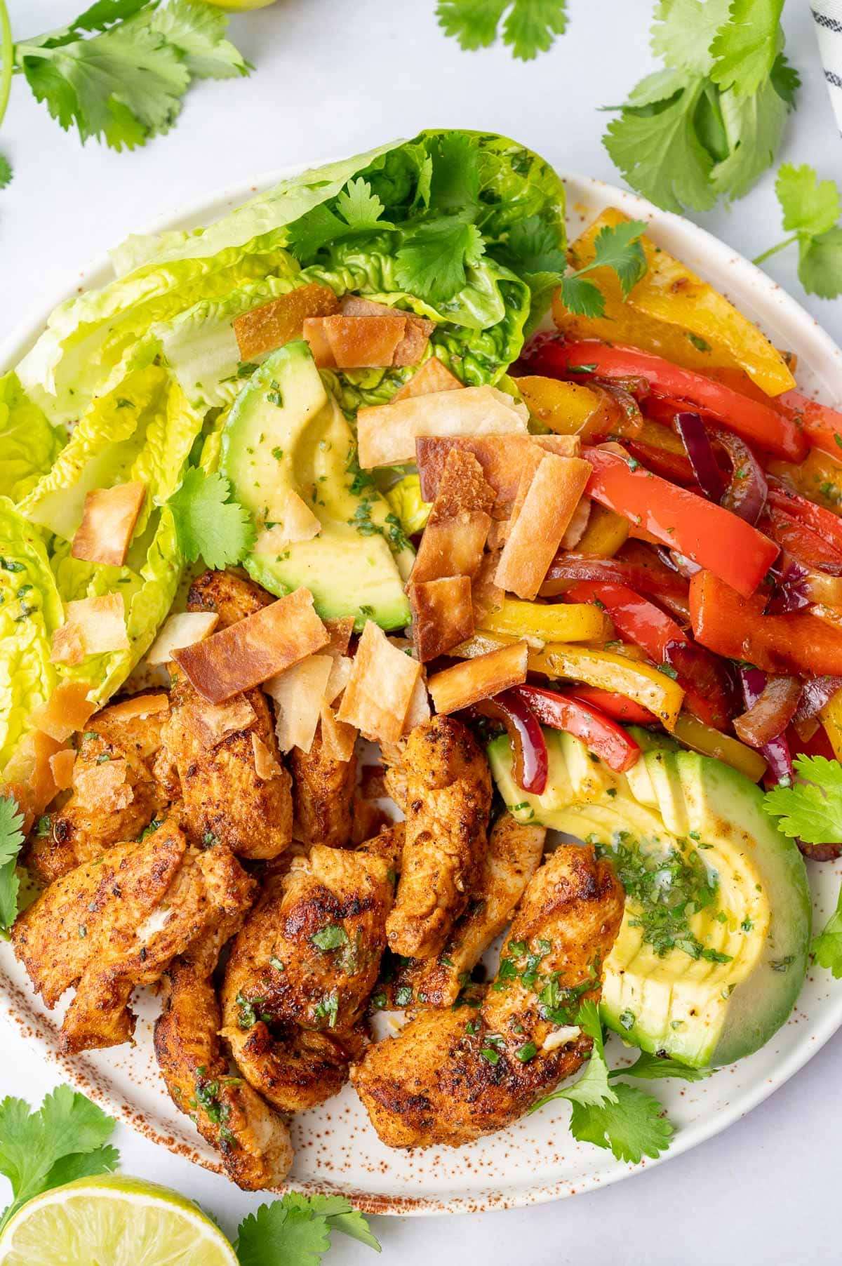 - Assemble: On a large platter, arrange the lettuce, cooked chicken, cooked bell peppers and onions, sliced avocado, and tortilla strips. Pour over the vinaigrette.