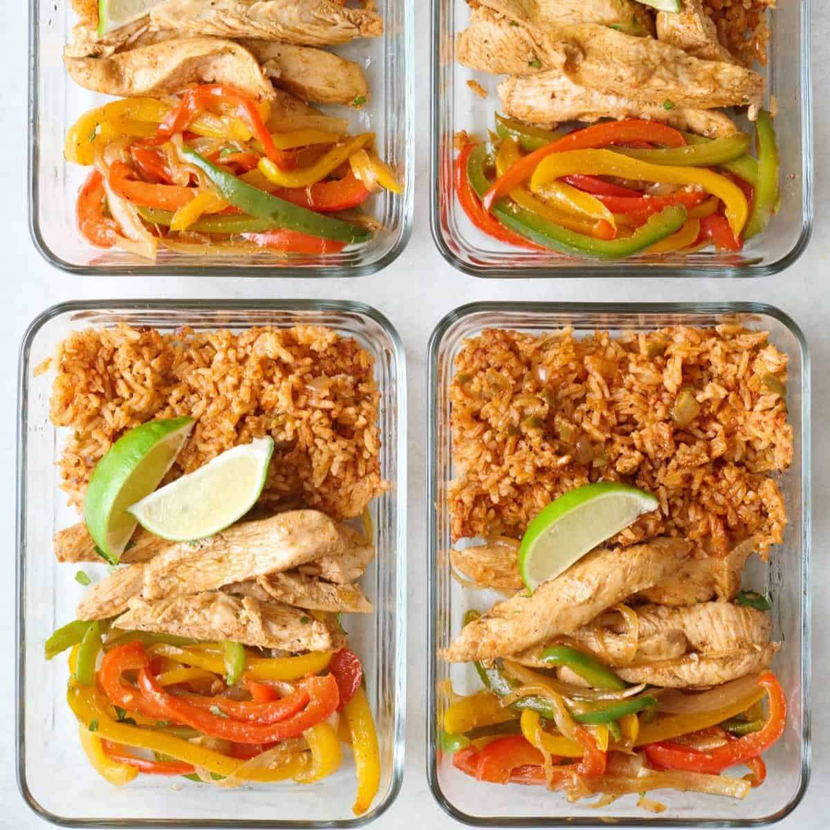 This Chicken Fajita Meal Prep Recipe takes less than an hour for 4 lunches (like 10 minutes per lunch!). Includes rice, onion, peppers and chicken.