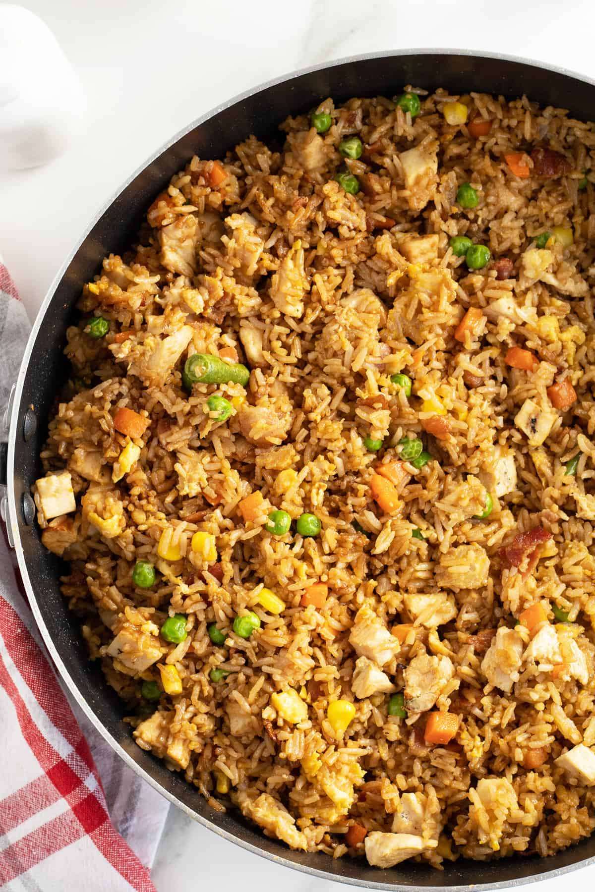 If you have some leftover chicken and rice from a different meal, you can make this Chicken Fried Rice whenever you like in barely any time at all!