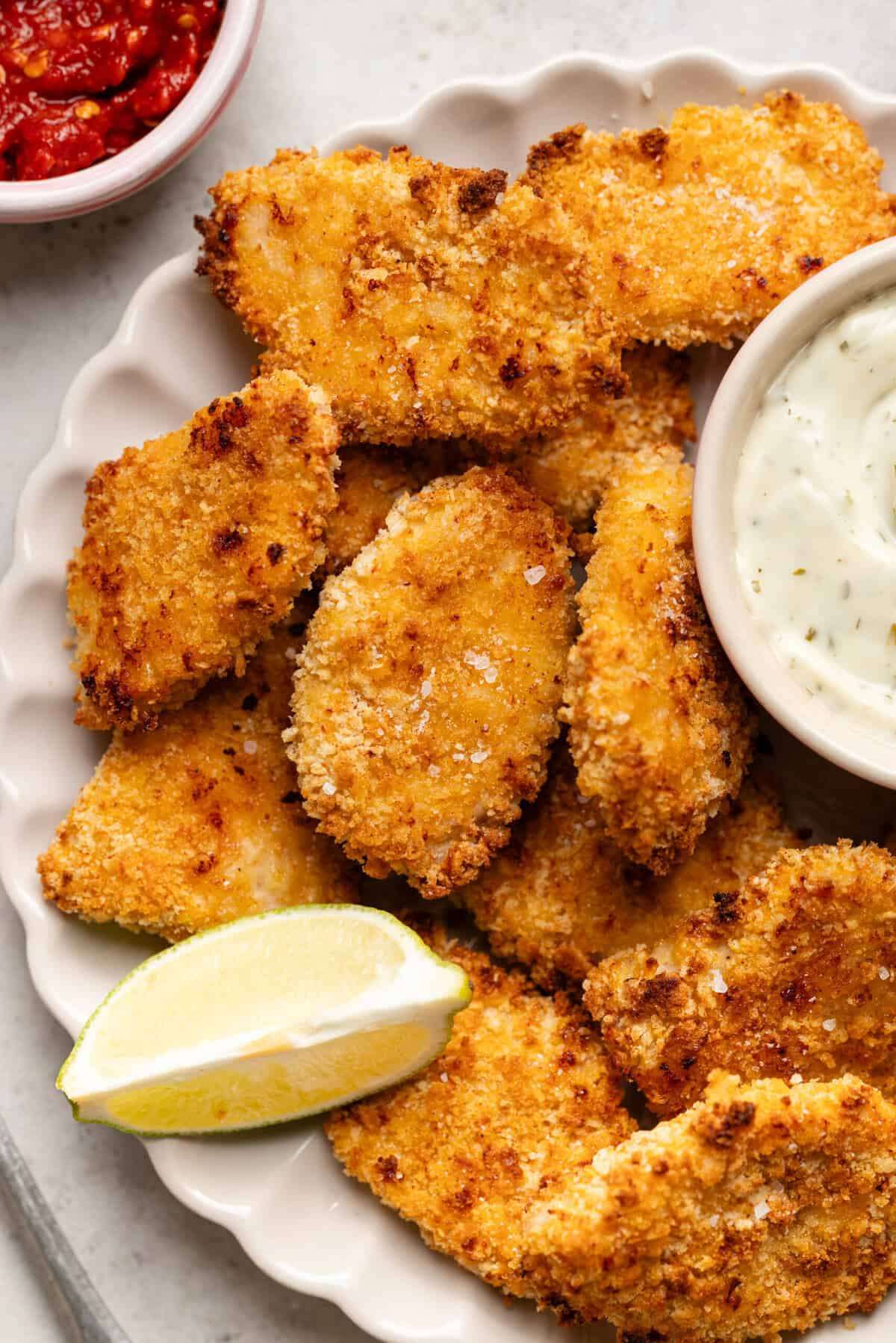 - Mist the coated chicken with olive oil cooking spray. Bake in the preheated oven for 15-20 minutes, or until golden brown and the internal temperature hits 165°F. If you prefer them extra crispy, broil the chicken pieces at the end of cooking until golden. Serve warm with your preferred dipping sauce.