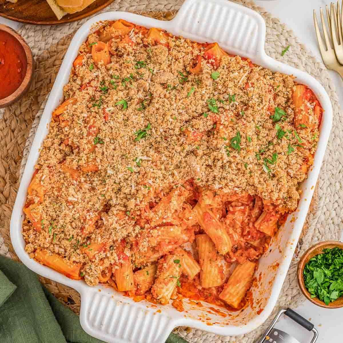 - The pasta will cook more in the oven so don’t overcook the pasta when boiling it.