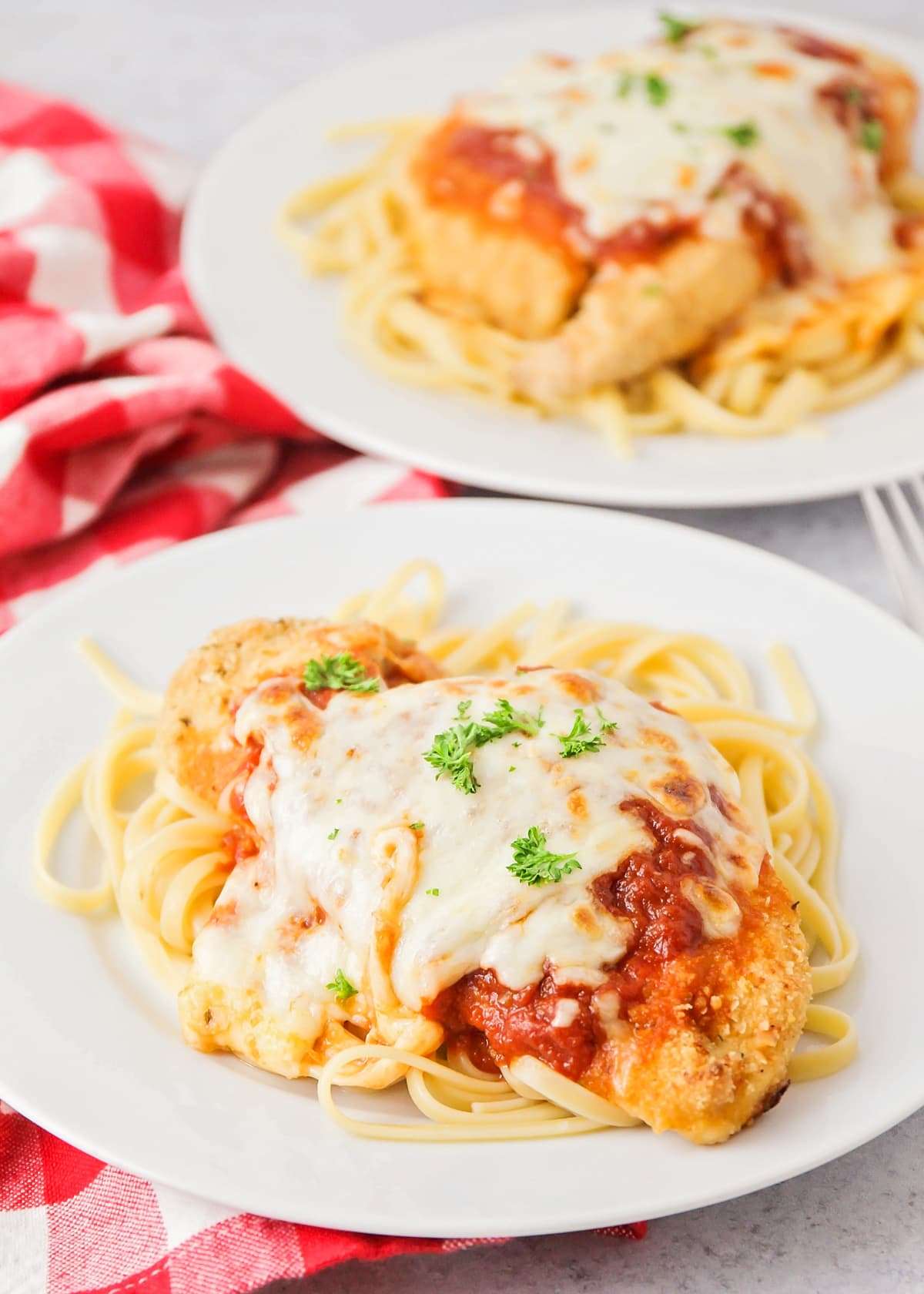 Deliciously crispy chicken parmesan is smothered in marinara and served over pasta for a restaurant-quality dish made right at home!