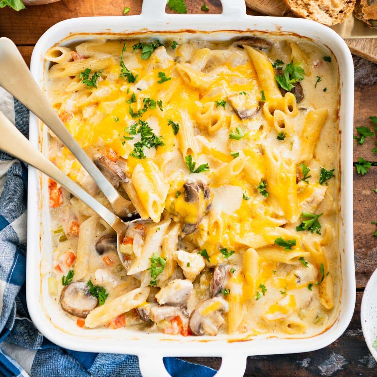 - Preheat the oven to 425°F. Spray an 8-inch square baking dish with cooking spray and set aside. In a large bowl, whisk together the condensed soup, milk, chicken broth, salt, pepper, and garlic powder. Stir in the onion, mushrooms, bell pepper, celery, raw chicken, uncooked pasta, and ½ cup cheese.