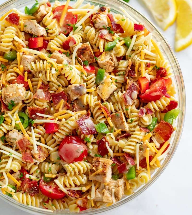 - Add the cooled pasta to a large bowl. Add ¼ cup salad dressing and toss to coat evenly. Add the chicken and another ¼ cup dressing, toss to coat. Add the cherry tomatoes, bell peppers, and ¼ cup dressing. Add ½ of the bacon and ½ of the cheese and toss to combine.