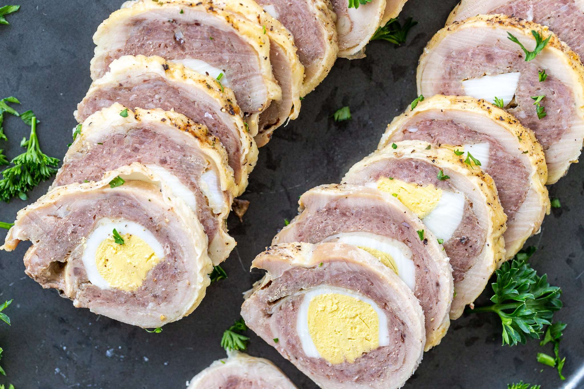 - Lay the pounded chicken thighs out on a clean cutting board. Sprinkle them with a little garlic parsley salt. Cover the chicken with a layer of the ground meat mixture. Place two hardboiled egg halves next to each other at either end of the chicken thigh.