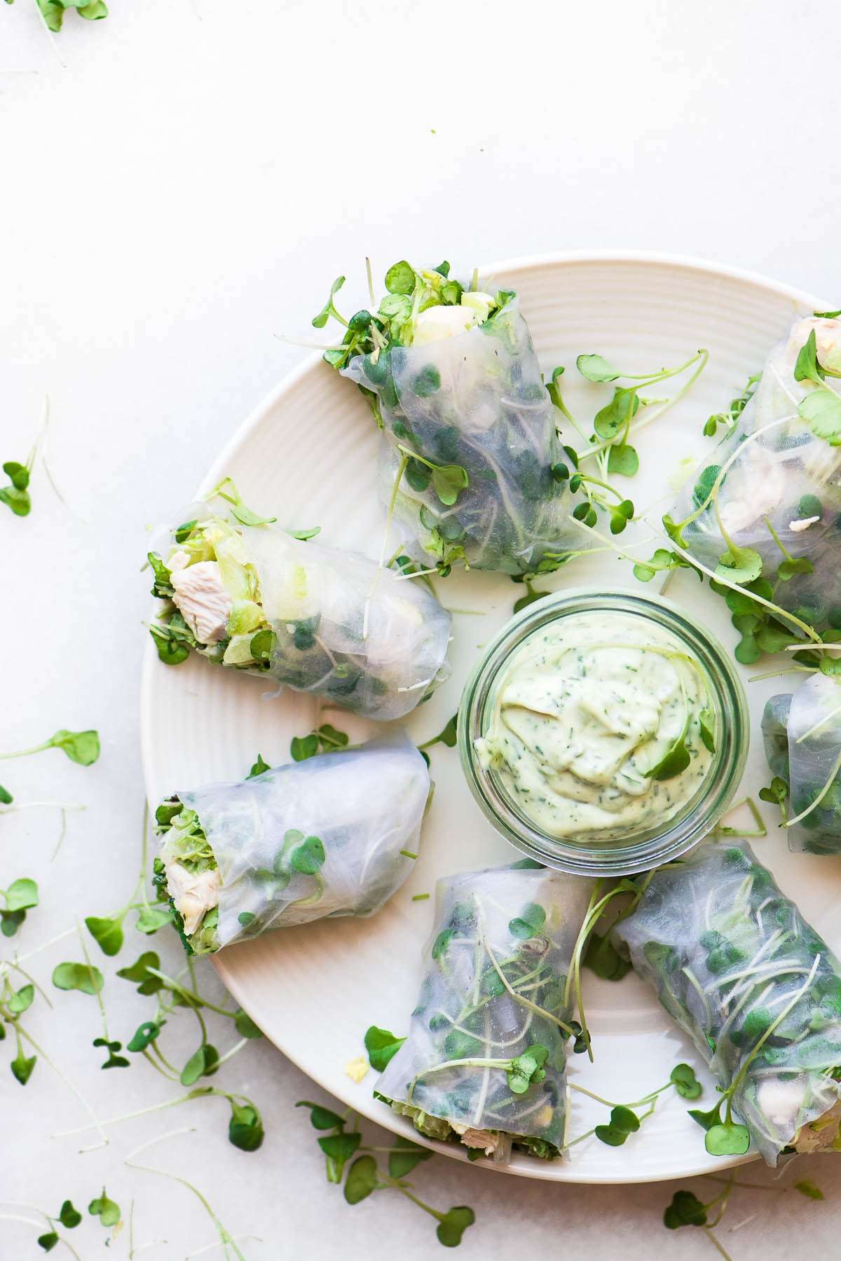 - To assemble the rolls, put some cold water in the bottom of a pie plate or large shallow bowl. Working one at a time, dip a rice paper wrapper into the water for about 8-10 seconds, just until it starts to soften, and then put it on a smooth surface. A flat counter top works well, or any other smooth flat surface. Arrange a small bunch of micro-greens in the center of the paper, and top with about 1/4 cup of chicken salad, arranged in a line. (see photo in the post)