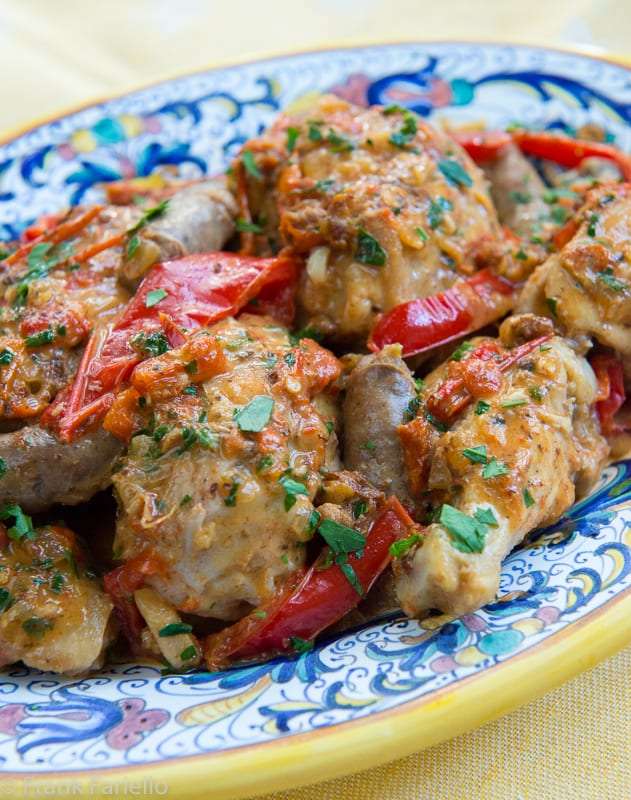 - Bring the the liquid to a simmer, then add back the chicken and sausage, along with the cherry peppers and a pinch of oregano. Cover and let simmer for 10 minutes, then remove the lid and continue to simmer for 10-15 minutes more, or until the chicken has cooked through and the liquid has reduced into a sauce that clings to the chicken pieces.