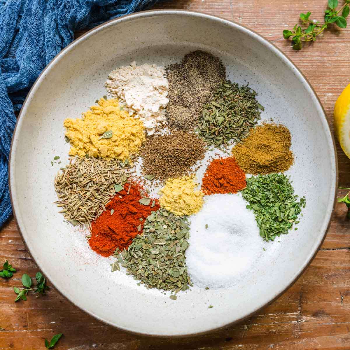 - Mix the salt, basil, oregano, rosemary, paprika, black pepper, cumin, garlic powder, onion powder, mustard, thyme, celery seed, cayenne pepper, and chicken bouillon together in a small bowl until blended.