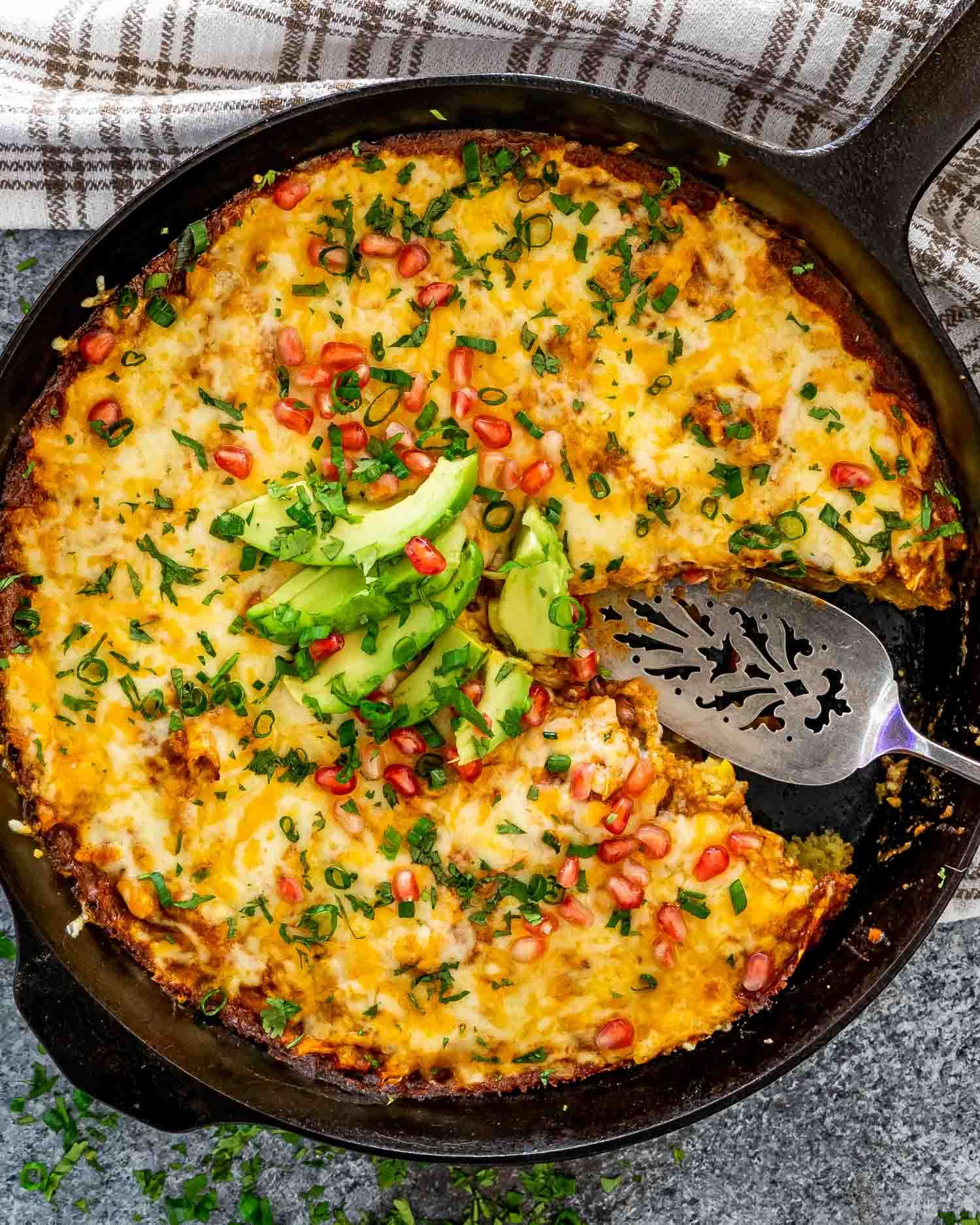 Chicken Tamale Casserole in a Skillet made from scratch! Delicious cornbread crust topped with shredded chicken, enchilada sauce and loads of cheese, and clocking in at under 300 calories per serving!