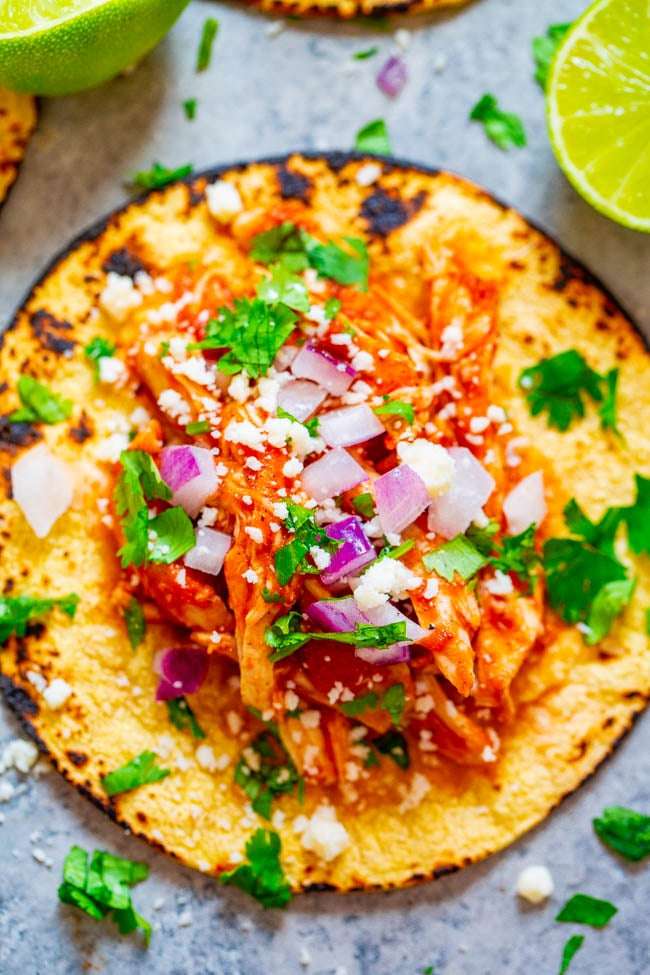- Add chicken to each tortilla and evenly garnish with red onions, cilantro, cotija, lime juice, and serve immediately. Extra chicken will keep airtight in the fridge for up to 5 days.