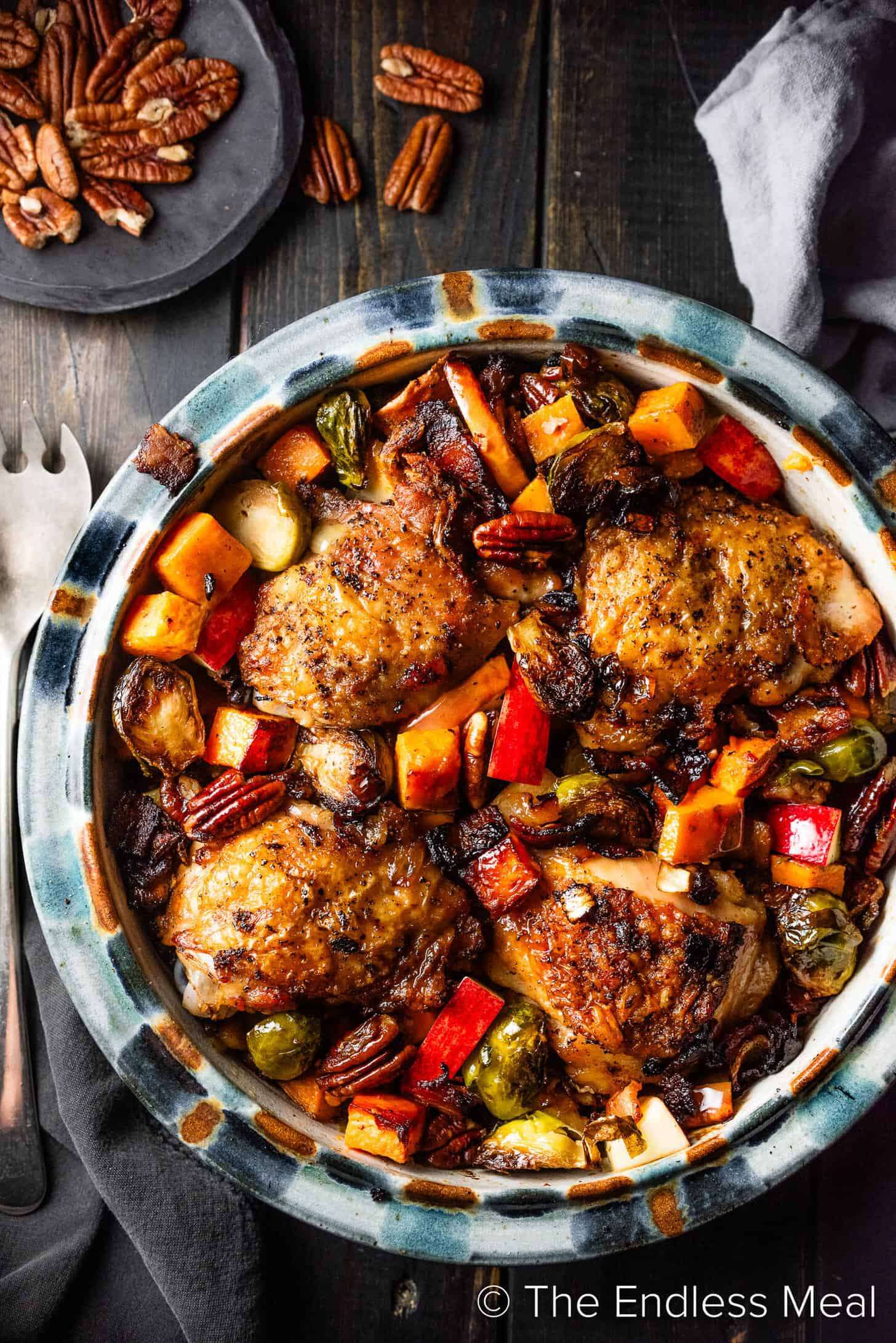 This chicken with brussels sprouts and sweet potatoes is an easy way to enjoy all the flavors of fall in one dish! Crispy chicken is nestled into a bed of tender veggies with bacon and pecans. It all gets roasted in the oven for a simple and nourishing seasonal meal that's ready in under an hour!