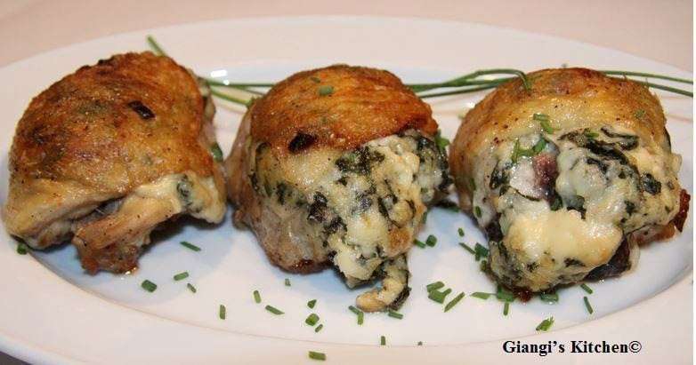 - Separate the skin from the chicken meat, insuring that the end are not separate but forming a pocket, and fill the pocket with the gorgonzola spinach mixture.
