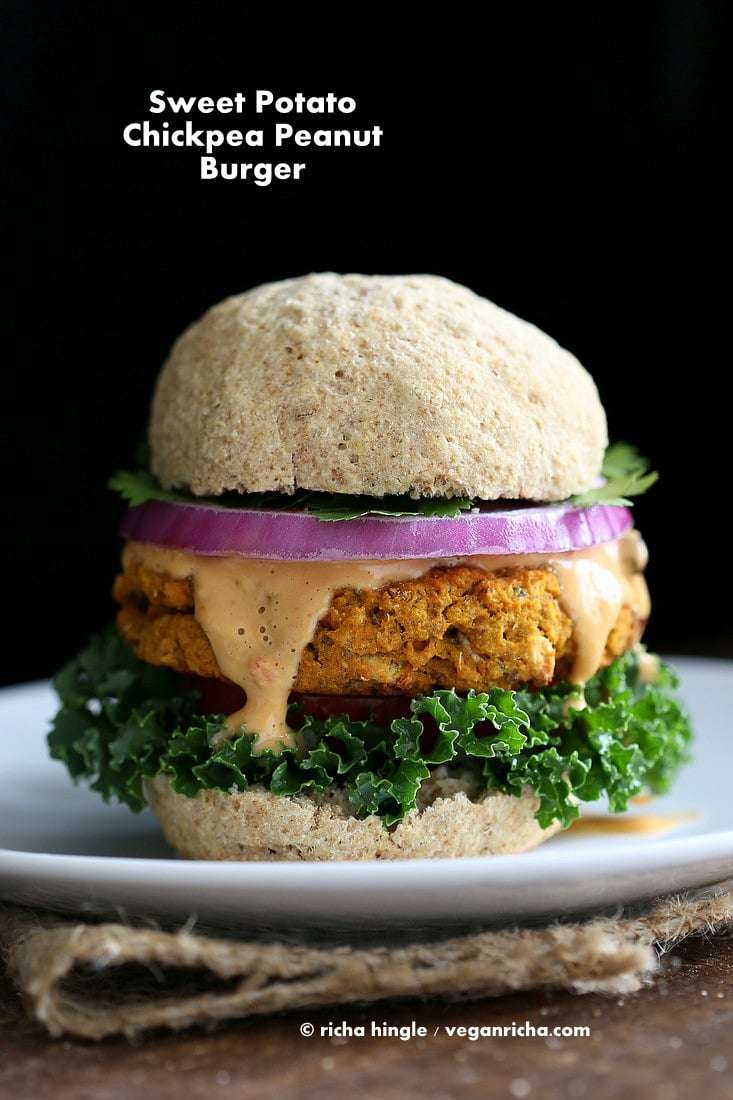 These Sweet Potato chickpea Peanut Burgers have an asian twist to them. Served with Almond Sriracha Sauce (use Peanut butter or seed butter for variations) Free of Dairy, egg, corn. Can be made soy-free, gluten-free. Makes 6 to 8 patties
