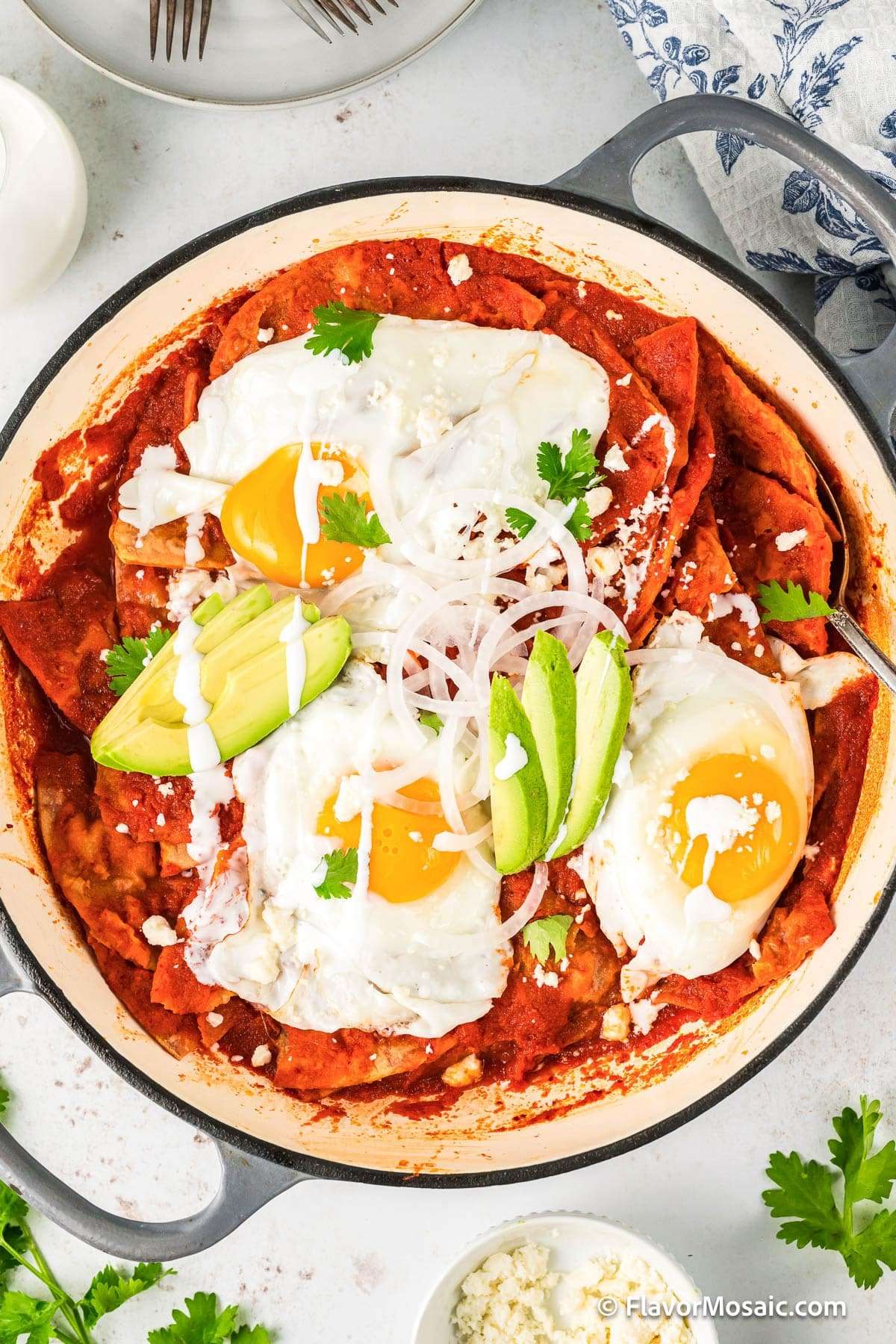 - Lay the eggs on the chilaquiles, then drizzle with cream and a sprinkle of queso fresco. Add some sliced onion, avocado and cilantro.