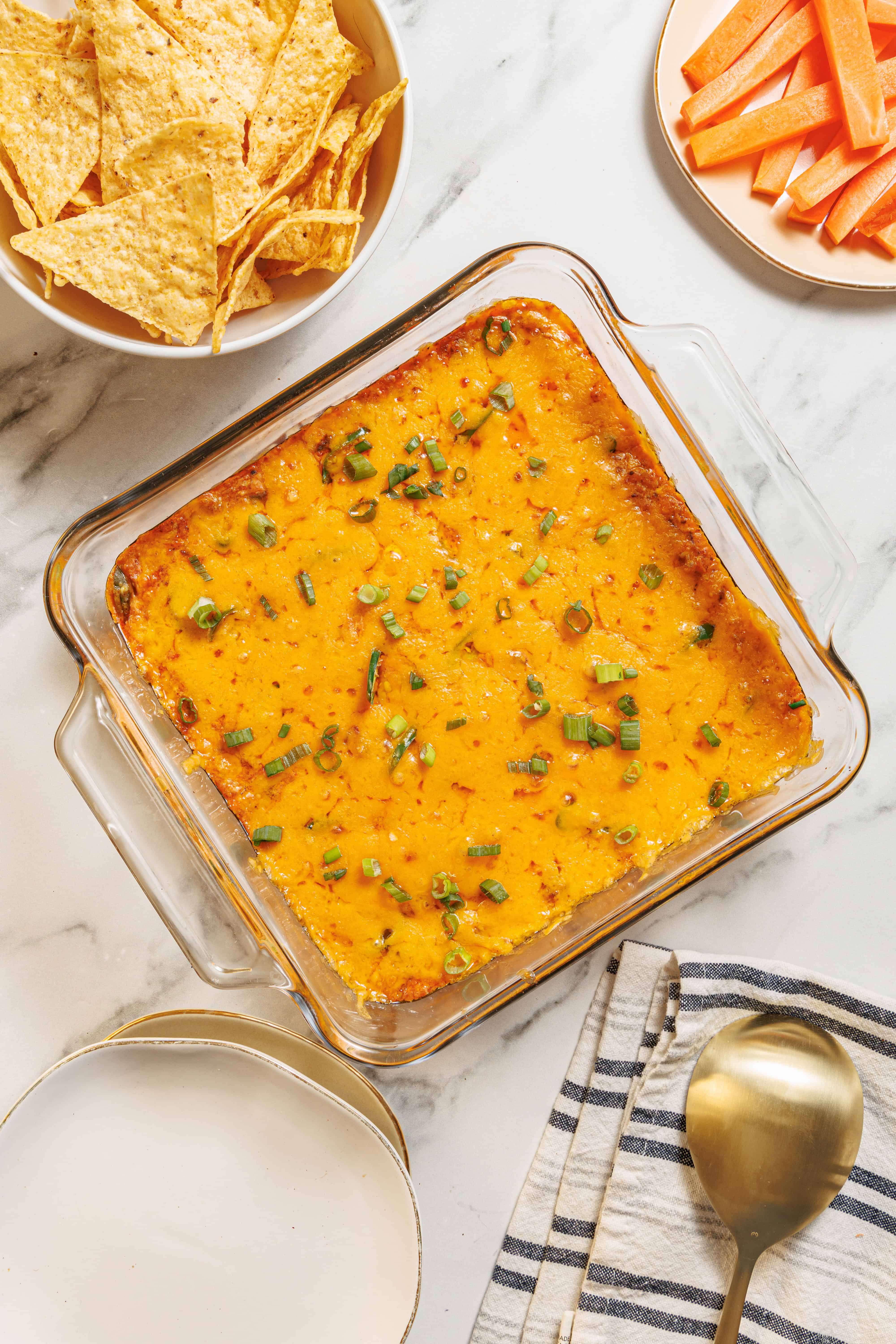 - Transfer the mixture to an 8x8-inch baking dish. Bake for 15 minutes or until the dip is heated through.