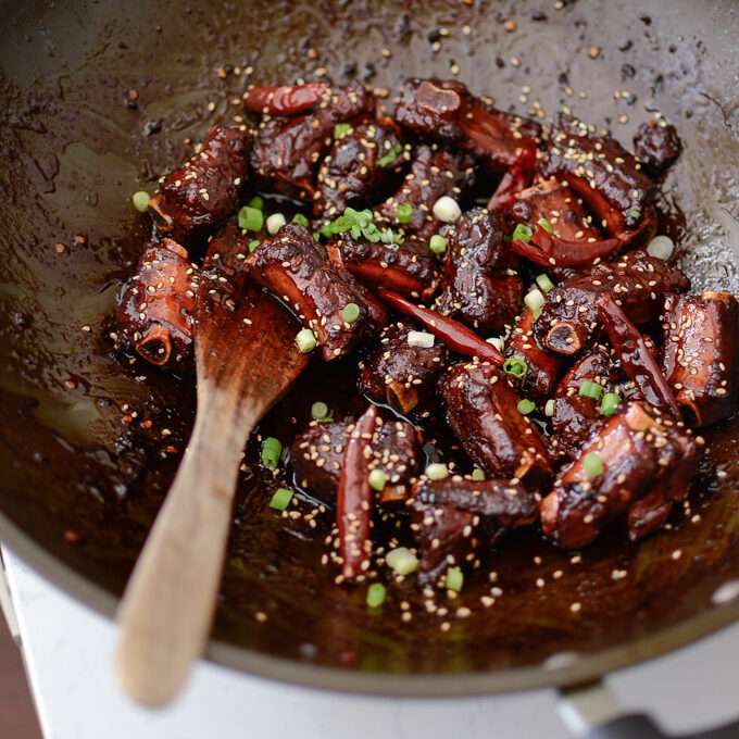 - When the sauce starts to thicken and turns into a glaze, reduce the heat a little so that you don't burn the sauce. Continue until it becomes a very thick glaze to coat the ribs. Remove from the heat and garnish with toasted sesame oil and chopped green onion, if you wish.