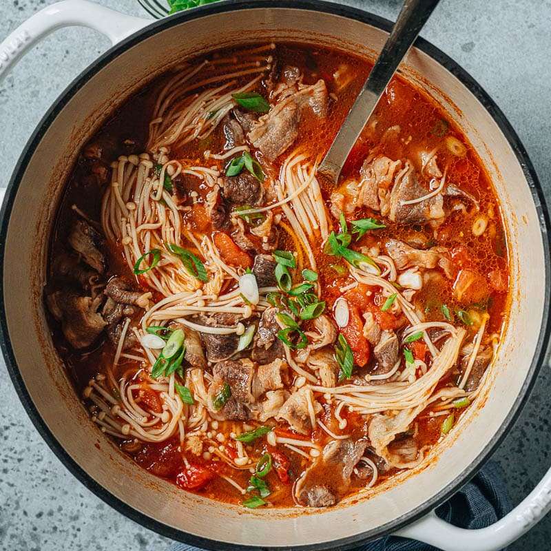 - Add the beef slices. Let cook, while skimming off the foam and discarding it, until the soup is clear, 3 to 4 minutes.