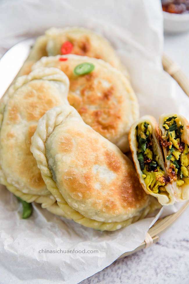 Crispy chive pocket with chopped chive, scrambled egg and dried small shrimp as filling. Crispy surface and juicy filling. This is known as Jiu Cai He Zi.