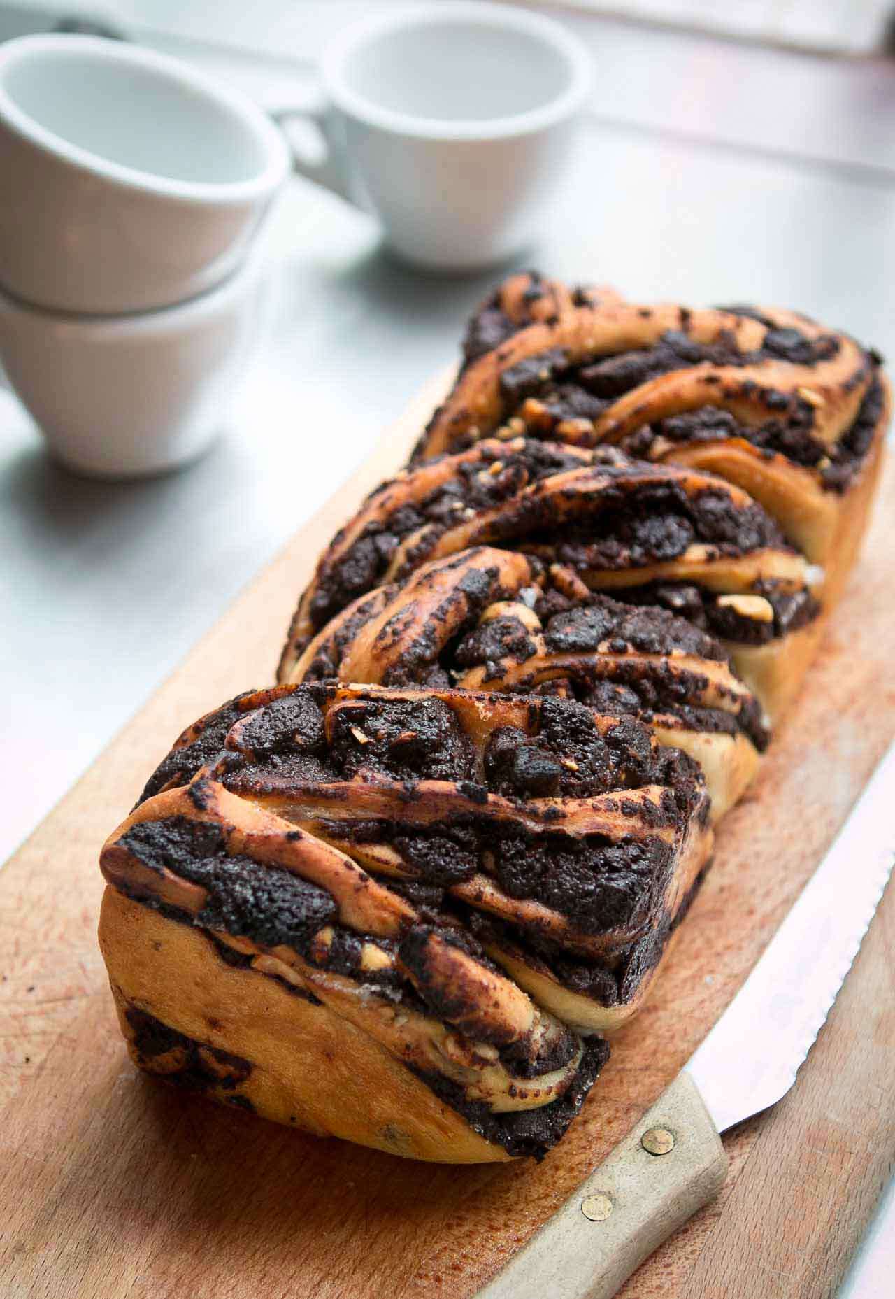 Adapted from Honey & Co. Baking Book by Sarit Packer and Itamar SrulovichI used leftover cookie bits in the babka which dialed up the chocolate flavor beautifully, but you can omit them. (The recipe is the Chocolate Wafer Cookies in .) Or if you are on a nut-free diet, you can omit the nuts and just use the cookie (or brownie) bits.This can, of course, be made by hand without a stand mixer. Simply mix the ingredients for the dough in a mixer bowl, then turn the dough out onto a lightly floured countertop and knead until smooth. One interesting variation I saw was using spelt flour in this adaptation of the same recipe: .The original recipe said to chill the dough after the initial mixing, after step 3, for at least 6 hours, or overnight. I made it several ways – including once rolling it out right away, and it worked fine without the overnight in the refrigerator. But usually doughs like this improve if left to rest overnight, so if you can wait that long, I’d do that.