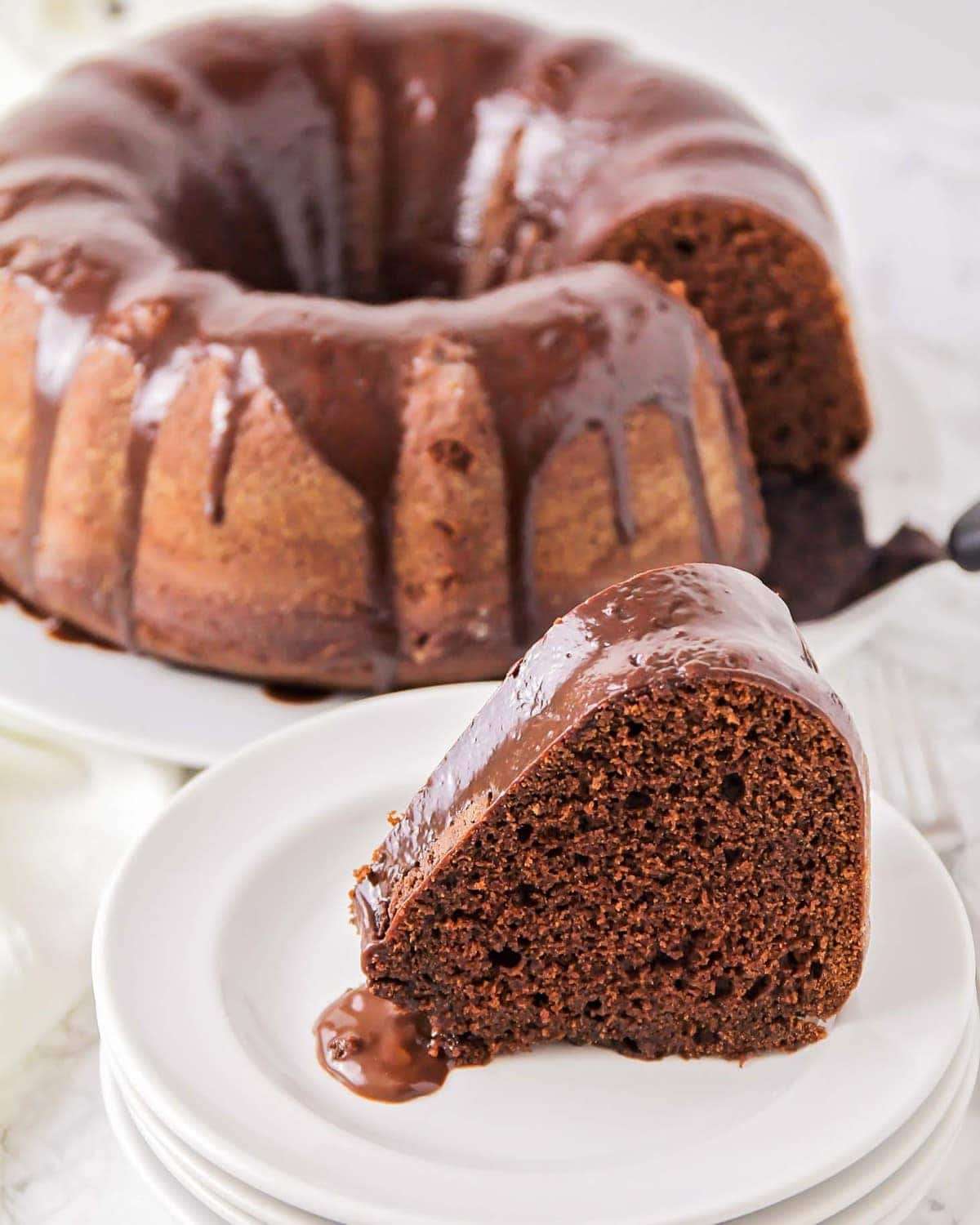 Indulge in this simple Chocolate Bundt Cake with chocolate glaze. It's perfect for chocolate lovers with the right amount of rich!