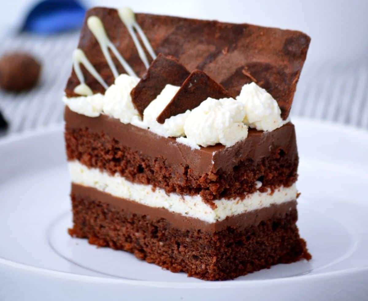 - Cut the sponge in half. Place one piece on a platter and spread a third of the chocolate cream on it. Pour the cream cheese over the chocolate cream. Add the second layer of cake and top it with the rest of the chocolate cream. Decorate with whipped cream and chocolate, then place in the refrigerator. It is best to slice the cake the next day when the creams are fully set.