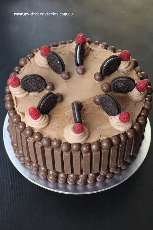 - Decorate with Kit Kats and Maltesers, Oreo biscuits and raspberries. I used two layers of Maltesers on the bottom because my cake was very tall and the Kit Kats needed extra height