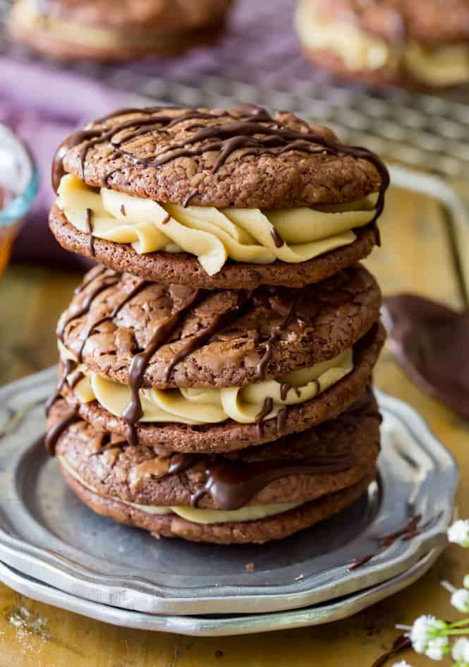 These Chocolate Caramel Sandwich Cookies are rich chocolate cookies sandwiched around a salted caramel cream filling.Cookie recipe adapted from BHG