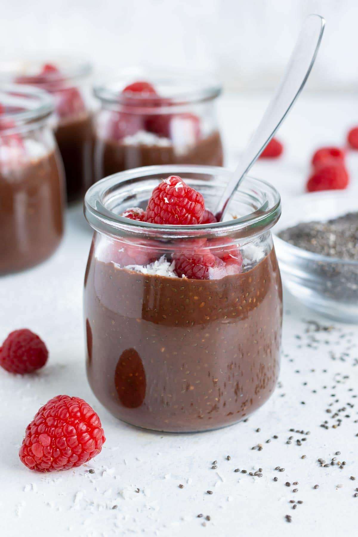 - Give the pudding another good stir and then serve with fresh raspberries, shredded coconut, and chocolate shavings. Enjoy!