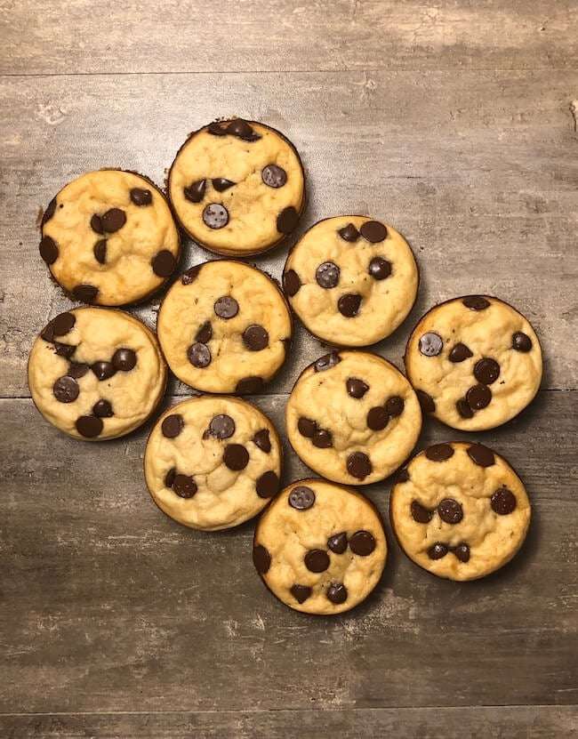 Chocolate Chip Banana Bread Protein Muffins made from oats, Greek yogurt, bananas, and protein powder. These muffins are topped with chocolate chips but you could also do blueberries if you wanted something lower in calories.