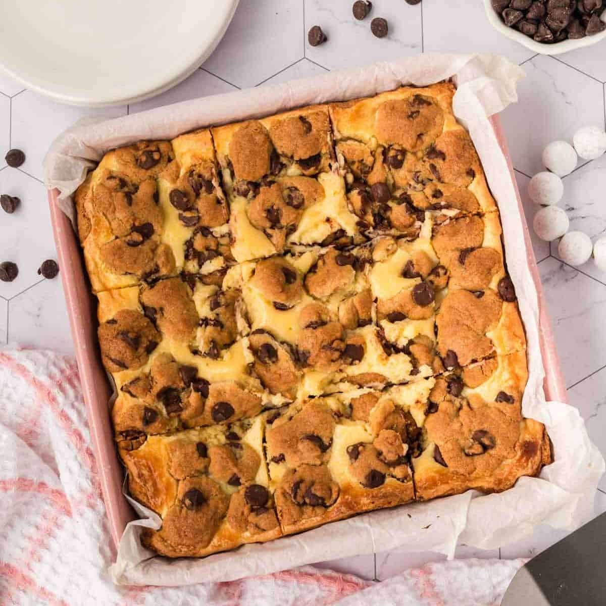 Need a an easy dessert - make these chocolate chip cookie cheesecake bars. YUM! They are the perfect marriage of chocolate chip cookies and cheescake!